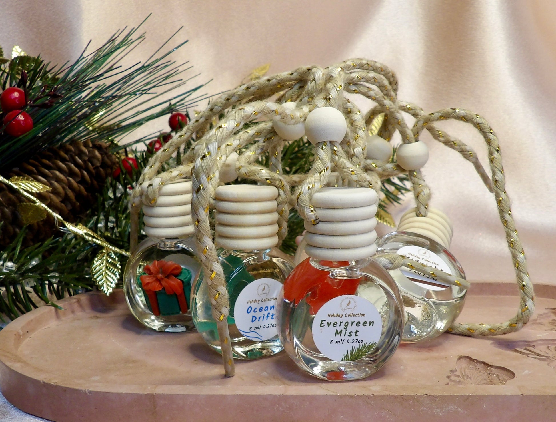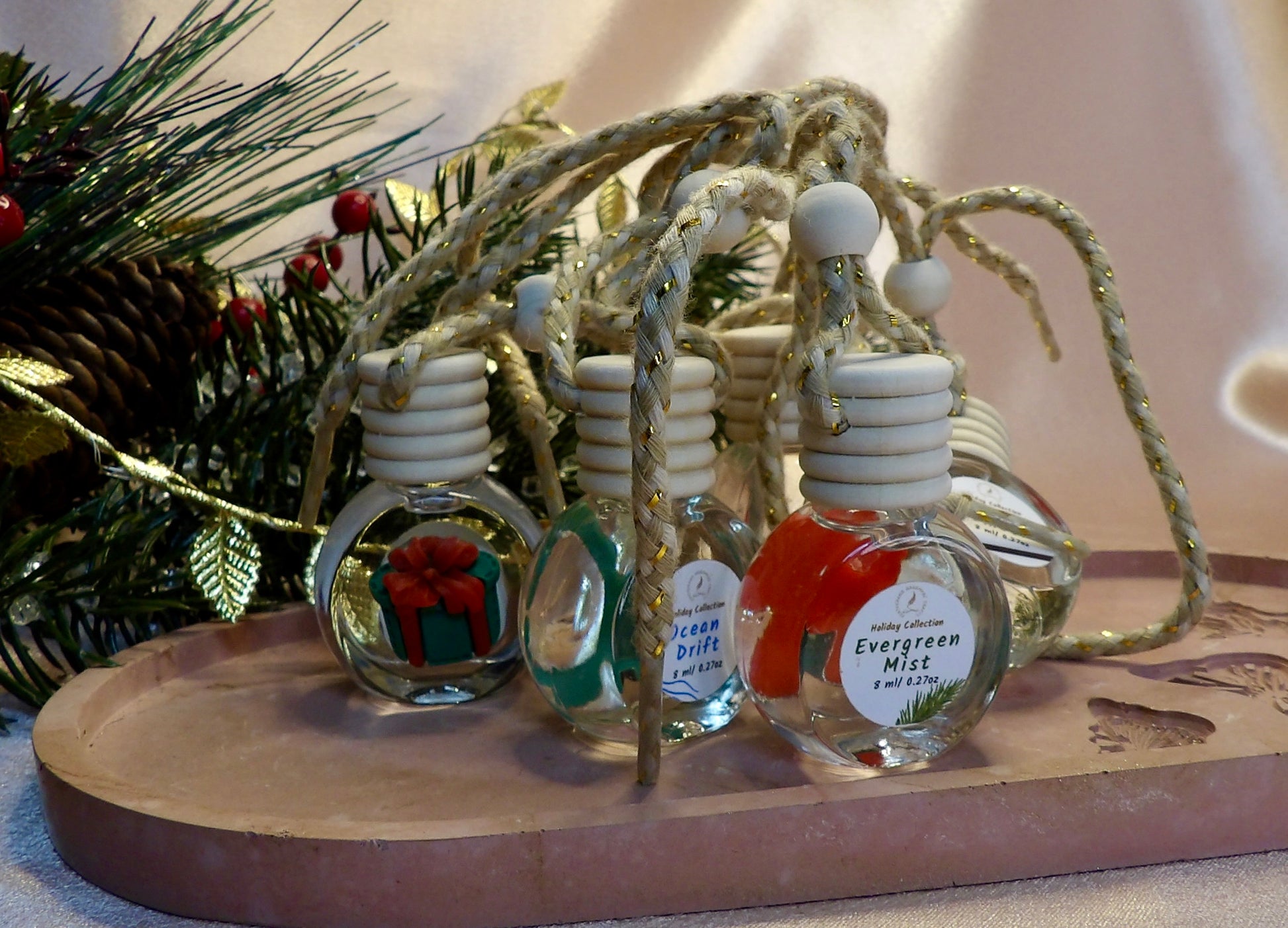 Each mini hanging diffuser doubles as a holiday ornament, handcrafted with eco-based diffuser oil and non-toxic, phthalate-free fragrance oils for a safe, long-lasting aroma. Perfect for cars, closets, or Christmas trees, these festive bottles bring holiday cheer wherever they hang.